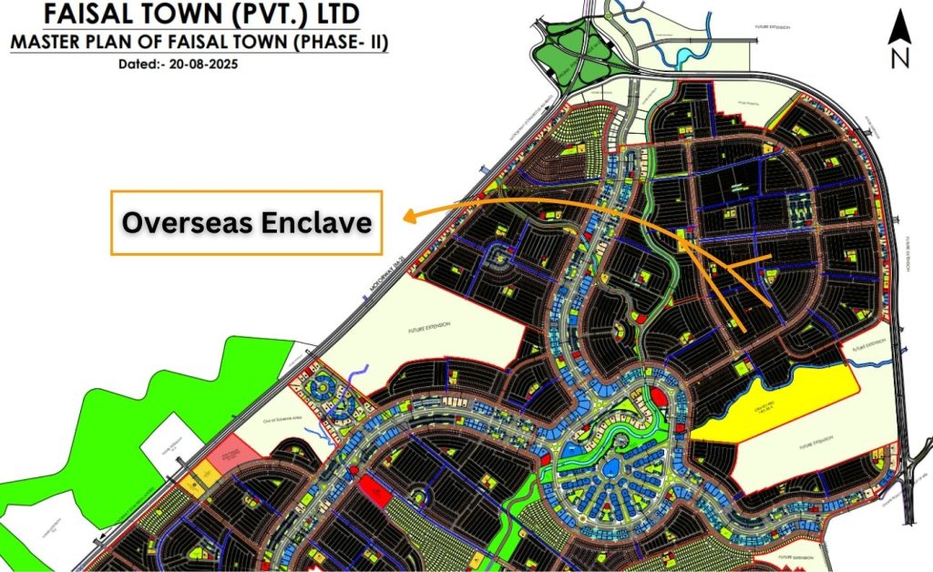 Strategically located near the main boulevard, it provides seamless connectivity to the society’s central areas while maintaining privacy and security within a gated community. The Faisal Town Phase 2 master plan features well-organized residential plots, wide carpeted roads, underground sewerage, uninterrupted utilities, and a dedicated commercial hub for shopping and daily essentials. Lush green parks, landscaped green belts, and recreational spaces add to the enclave’s eco-friendly charm, while its proximity to educational institutions, healthcare facilities, and entertainment zones ensures convenience and accessibility. With its blend of secure living, contemporary infrastructure, and serene surroundings, the Overseas Enclave is set to become a prime residential destination within Faisal Town Phase 2.